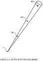 FIG. 4 illustrates an example embodiment of the calculations of the positions of the tracking marks and the tip of the pen. C is the position of the camera lens (convergence point). F is the central focal point of the camera on the image plane. Reference point T is the tip of the pen. M1, M2, and M3 are the three-dimensional positions of the tracking marks, and d0, d1 and d2 are the distances from T to M1, M1 to M2, and M2 to M3 respectively. P1, P2, and P3 are the projections of the tracking marks M1, M2, and M3 respectively on the two-dimensional camera image. The positions of P1, P2, and P3 are determined in the first step above. Angle a1 is the viewing angle between the tracking marks M1 and M2 as viewed from the camera. Angle a2 is the viewing angle between the tracking marks M2 and M3 as viewed from the camera. The positions of the tracking marks can be calculated using the following sub-steps: