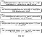 FIG. 6B is a flowchart illustrating the steps performed by the process pipeline shown inFIG. 6A. At step6102 a YCbCr color space video stream is input to a MAD instantiation for conversion to a RGB format. Atstep6104 an inverse Gama correction is applied to the output RGB data by using a LUT. In an embodiment, a function similar to Y(x)=x{circumflex over ( )}2.40 is applied to the RGB data. Atstep6106, the corrected RGB data output atstep6104 is input to a MAD instantiation for conversion to a XYZ format. At step6108 a correction function is applied to the output XYZ data by using a LUT. In an embodiment, a function similar to Y(x)=x{circumflex over ( )}0.33 is applied to the XYZ data. Atstep6120, the corrected XYZ data output atstep6108 is input to a MAD instantiation and converted to a LAB format.