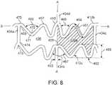 Referring toFIG. 8, thespace436 and436aofcell404 is bounded by the longitudinally spacedrings412band412cportions shown, and the circumferentially spaced andparallel links434aand434cconnectingrings412band412c.Links434band434dconnect thecell404 to the right and left adjacent ring inFIG. 7, respectively.Link434bconnects tocell404 at a W-crown409.Link434dconnects tocell404 at a Y-crown410. There are 12 unconnected orfree crowns407 forcell404, which may be understood as 12 crowns devoid of alink434 connected at the crown. There are three free crowns between a Y-crown and W-crown for thecell404.