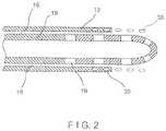Referring now toFIGS. 1 and 2, adistal end12 of alaser catheter10 for atherectomy procedures in accordance with one embodiment of the invention is shown. The laser catheter extends between distal12 and proximal14 ends thereof and is formed with acentral passageway16, which receives aguide wire18 inserted into the body lumen (e.g., vascular system) prior to catheter introduction. Thepassageway16 can also be used to remove/evacuate occlusion debris from an area near the distal end of the catheter. Theguide wire18 facilitates the advancement and placement of the laser catheter to the selected portion(s) of the body lumen for laser ablation of tissue.