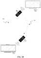 FIG. 7F is a conceptual diagram750 illustrating a selection of an intended device for a command according to some implementations of the invention. In the diagram750, the UWBremote device250 is in proximity todevices755,756,757, and758 (referred to as “devices755-758”). As described above with regards toFIG. 7E, a position of the UWBremote device250 can be determined by the a UWB receiver on one of devices755-758 (in this case by device755). From an initial calibration process, the positions of each of the devices756-758 was determined. Thedirection759 of theUWB device250 is determined and matched to the position ofdevice757.Device757 is thus determined as the intended device. A command (in this case a power on command), issued by the UWBremote device250, is routed to thedevice757. In some implementations, the command is communicated to thedevice757 via a UWB connection to the intendeddevice757. In other implementations, the command received by thedevice755 with a UWB receiver and the device forwards the command to the intendeddevice755 or sends an alternate command to thedevice755 causing the command from theUWB device250 to be implemented by the intendeddevice757. For example, thedevice755 can use a HDMI consumer electronics control (HDMI-CEC) connection to power-on, set input source, etc. for the intendeddevice757.