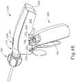 FIG. 117A shows waveguide (1092) being initially inserted into waveguide guiding member (1200) at an orientation where post (1099) is angularly misaligned by approximately 45° clockwise (viewing distally from threaded stud (1096)). As the operator inserts waveguide (1092) further distally as shown inFIG. 117B, post (1099) first engages cam surface (1214), passing cam surface (1212) without engaging cam surface (1212). If waveguide (1092) were initially misaligned to a greater angle clockwise, post (1099) would have engaged cam surface (1212) first. As the operator inserts waveguide further distally (1092) as shown inFIG. 117C, post (1099) engages cam surface (1216). Due to the helical orientation of cam surface (1216), cam surface (1216) acts against post (1099) to rotate waveguide (1092) counterclockwise. This counterclockwise rotation continues as waveguide (1092) is inserted further distally as shown inFIG. 117D, until post (1099) eventually encounters the gap defined between cam surfaces (1218,1244). As waveguide (1092) is inserted further distally as shown inFIG. 117E, cam surfaces (1218,1244) cooperate to guide waveguide (1092) through a certain range of longitudinal motion without rotating waveguide (1092). Post (1099) eventually encounters cam surface (1246), as shown inFIG. 117F. At this point, the complementary helical orientations of guide surfaces (1220,1246) cooperate against post (1099) to guide waveguide (1092) distally while rotating waveguide (1092) clockwise as waveguide (1092) is inserted further distally as shown inFIG. 117G. Post (1099) eventually encounters cam surface (1222) as shown inFIG. 117H. As waveguide (1092) is inserted further distally as shown inFIG. 117I, cam surfaces (1222,1248) cooperate against post (1099) to guide waveguide (1092) without rotating waveguide (1092) until post (1099) nears end surface (1260). In the present example, post (1099) does not actually contact end surface (1260) or cam surfaces (1222,1248) when waveguide (1092) is fully disposed in waveguide guiding member (1200). Instead, engagement between pin (1094) and arms (2012) of inner tube coupling member assembly (1150) arrests longitudinal advancement of waveguide (1092) and maintains the position of waveguide (1092) relative to waveguide guiding member (1200) such that post (1099) is slightly spaced away from end surface (1260) and cam surfaces (1222,1248).