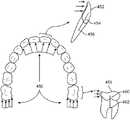 FIG. 4B illustrates anon-uniform force distribution450 applied on teeth during mandibular advancement. In the lower arch, since the lingual surface of the anterior teeth is relatively large compared to the distal surface area of the posterior teeth, the majority of the force is applied to the anterior teeth. An anterior tooth452 (e.g., incisor) can be more susceptible to tipping, since the force applied to the tooth has alarge moment arm454 with respect to the center ofresistance456, creating a large tipping moment. In contrast, a posterior tooth458 (e.g., molar) can be less susceptible to tipping, since the applied force has asmaller moment arm460 with respect to the center ofresistance462. The remaining force can be distributed among the exposed surfaces of other teeth, e.g., the interproximal, buccal, lingual, and/or occlusal surfaces. The amount of force applied to these teeth can depend on the extent to which the appliance contacts and engages the teeth, as described further herein.