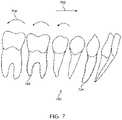 FIG. 7 illustrates improving anchorage to reduce tooth repositioning elicited by mandibular advancement, in accordance with embodiments. Anet anterior force700 is applied to a group oflower teeth702 to produce anterior displacement of the mandible. Each tooth has a certain amount ofroot surface area704 adjacent to the PDL. In order to decrease the amount of pressure exerted on the PDL, theteeth702 can be constrained to inhibit tipping and permit only translational movements. For example, this can be achieved by designing the appliance to apply one or more moments708 (e.g., mesial root torques) to theteeth702 in a direction opposing theforce load700, thereby engaging theteeth702 while constraining them to a translational movement. The use of opposing moments can additionally be used to compensate and/or counteract undesirable tooth movements, such as anterior flaring. In the embodiment ofFIG. 7, each of themoments708 is applied to an individual tooth. Alternatively or in combination, a single moment can be applied to a group of multiple teeth.