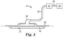 Referring toFIG. 5, a reducedpressure treatment system21 according to an embodiment of the present invention includes a reduced pressure dressing, orarticle10 fluidly connected to a reducedpressure conduit29. The reducedpressure conduit29 is fluidly connected to a reducedpressure source23 such as a vacuum pump or another source of suction. Thearticle10 is placed against atissue site31 of a patient and is used to distribute a reduced pressure provided by the reducedpressure source23. Typically, reduced pressure is maintained at the tissue site by placing an impermeable orsemi-permeable cover25 over thearticle10 and thetissue site31. The reduced pressure also serves to draw wound exudates and other fluids from thetissue site31. Acanister27 may be fluidly connected to the reducedpressure conduit29 and disposed between thearticle10 and the reducedpressure source23 to collect the fluids drawn from thetissue site31. Adistribution adapter35 may be connected to the reducedpressure conduit29 and positioned on thearticle10 to aid in distributing the reduced pressure to thearticle10.