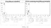 FIG. 22 show the drug release behavior of the sex hormone drug-bearing biodegradable polymer microparticles prepared in Example 4 (ethynyl estradiol, PLGA 50:50) over time, as monitored by HPLC.