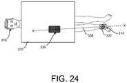 As shown inFIG. 24, in some embodiments a laser device332 may be removably coupled to an exterior of the patient310 (i.e., non-invasively coupled) along an axis X-X of, or associated with, an anatomical structure ofinterest314 in a spaced relationship therefrom. For example, with respect to an ankle arthroplasty, the laser device332 may be coupled topatient310 at or in alignment with the patient's femoral head, as shown inFIG. 24. The laser device332 may be directly coupled to the exterior of thepatient310, or indirectly couple via at least one intervening member (not shown). For example, as discussed above with respect toFIGS. 3-6, at least one base member (not shown) may be directly coupled to the patient's skin, and asterility barrier320 may extend thereover. The laser device332 may thereby couple with the at least one base member through or over thesterility barrier320, as shown inFIG. 24.