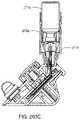 In some embodiments, theneedle housing6038 may includeend tabs6070,6072 which may accommodate a vial of fluid, e.g., therapeutic fluid, e.g., insulin, such that once the fillingsyringe6062 end (see4064 inFIG. 220A) is attached to theconnector6060, theneedle housing6038 may clip onto avial6080 having a septum6082 (also, for example, as shown inFIGS. 199A-199H in2716) and the fillingneedle6014 may penetrate theseptum6082 and the fluid may flow from thevial6080 to the fillingsyringe6062 by way of the fillingneedle6014. Once a desired volume of fluid flows from thevial6080 to the fillingsyringe6062, thevial6080 may be removed from theneedle housing6038, e.g., by exerting opposing force onto theneedle housing6038 and thevial6080 so as to disconnect theend tabs6070,6072 from thevial6080.