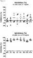 FIG. 3. TNF secretion is inhibited by treatment with monoclonal antibodies Inhibition of CD40L-induced TNF secretion by monoclonal antibodies against CD40. PG102 WT and new antibody variants are tested at a concentration of 1 ng/ml or 10 ng/ml on Peripheral blood mononuclear cells (PBMC) from four different donors (represented by data points). Graph shows percentage inhibition of TNF secretion.