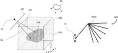 In path tracing, such as Monte Carlo path tracing, light propagation through thevolume300 is simulated, including simulating scattering and absorption, by tracing a plurality, for example millions, of simulated light rays30. Data gathered from the traced light paths is used to generate display values for the pixels making up the image of thevolume300. In examples, the gathering of data by tracing light paths may be separate from the collection of this gathered data into a final image. This fact may be exploited in some acceleration techniques, such as trajectory splitting and temporal data reusage, which are mentioned above and will now be discussed in further detail.
