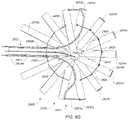 FIG. 7E shows the portion of thedevice2600 in deployed configuration also referred to as a third or expanded configuration. In this illustrated embodiment, theelongate members2604 were moved from the second/bent configuration shown inFIG. 7D to the third/expanded configuration shown inFIG. 7E. In this example embodiment, the portion of thedevice2600 is further advanced throughcatheter sheath2606 so that at least the respectivethird portions2609c(only one called out) of various ones of theelongate members2604 are clear of the confines ofcatheter sheath2606. In this example embodiment, the portion of thedevice2600 is further advanced throughcatheter sheath2606 so that at least the respectivefirst portions2609a(only one called out) of various ones of theelongate members2604 are clear of the confines ofcatheter sheath2606. As shown inFIG. 7E, the respectivesecond portions2609b(only one called out) of various ones of theelongate members2604 are spaced apart from one another in the third/expanded configuration. In this illustrated embodiment, at least the respectivesecond portions2609bof various ones of theelongate members2604 are angularly spaced with respect to one another about an axis when the portion of thedevice2600 is in the third/expanded configuration. In this illustrated embodiment, at least the respectivesecond portions2609bof at least some of theelongate members2604 are fanned with respect to one another about one or more fanningaxes2635 into a first fannedarray2670 when the portion of thedevice2600 is in the third/expanded configuration. As shown inFIG. 7E, in this example embodiment the one or more fanningaxes2635 are arranged to pass through a plurality of spaced apart locations along the respective length2611 (not called out) of each of the at least some of theelongate members2604 when the portion of thedevice2600 is in the third/expanded or fanned configuration. In this example embodiment, the one or more fanningaxes2635 are shown as a single axis (i.e., also referred to as fanning axis2635) for clarity. It is understood that one ormore axes2635 can include two or more axes in various embodiments. In this illustrated embodiment, each of the at least some of the plurality ofelongate members2604 includes a curved portion arranged to extend along at least a portion of a respective curved path that intersects fanningaxis2635 at each of a respective at least two spaced apart locations along fanningaxis2635 in the third/expanded or fanned configuration.