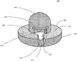 In some implementations, thebase portion204 may include two opposingchannels212, an entrance channel extending from an entrance end of the channel at anexterior port230 of the receptacle to a first interior location in the receptacle that is proximal to a placement position for the active marker light component, e.g. proximal to the bottom area of the chamber. An opposing exit channel may extend from a second interior location proximal to the placement position for the active marker light component to an exit end at another exterior port230 (not shown). For example, the interior locations may be a platform or other surface upon or over which the active marker light component rests when installed into the receptacle.