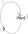 A fly-aroundflightpath559 as illustrated inFIG. 5B is selected in a manner analogous to that described with reference toFIG. 5A, the difference being that therotational axis556 of thedrone104 at launch a substantially vertical. Based on such an uprightrotational axis556, thedrone104 automatically follows an arc lying in a substantially horizontal plane while continuously capturing video content focused on theoperator100