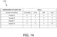 FIG. 14 depicts a ninth example1400 of information that can be displayed in the user interface106, in which the user interface106 displays a table of dependency counts by supplier. The table shown inFIG. 14 can indicate total counts of dependencies associated with one or more suppliers, and/or counts of dependencies associated with the suppliers that are in-progress, committed, and/or done.