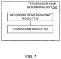 On the other hand, when it is necessary to combine a beam, the transmissionbeam determining unit640 combines the leading beam with another beam.FIG. 7 is an exemplary block diagram to show a transmission beam determining unit according to one example of the present invention. As shown inFIG. 7, the transmissionbeam determining unit640 includes a secondarybeam acquiring module710 and acombination module720. The secondarybeam acquiring module710 acquires a secondary beam and the secondary beam's combination coefficients based on the combination information. Then, thecombination module720 acquires a transmission beam for the mobile station based on the leading beam, the secondary beam and the secondary beam's combination coefficients. As described above, the combination coefficients include an amplitude coefficient and a phase coefficient. For example, a transmission beam is acquired by combining the leading beam and the secondary beam according to equation 1 above.
