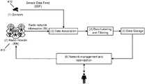 3) The association of RI and SDF may refer, for example, to associating the two data streams in time domain; sensor feed sample SDF(k,t1) for sensor k at time t1, is associated with RN information RI(j,t2) from base station j at time t2, where time difference |t1−t2| is within time window threshold. For example, an image from a camera k captured at time t1, is associated with signal strength measurement of base station j at time t2. In a further embodiment, the association is done only for pre-configured pairs of devices (e.g. a base station is paired with cameras that capture images from area that overlaps with coverage area of the base station or coverage area of its' strongest interferers).