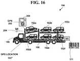 FIG. 16 is a block diagram194 illustrating vehicles on a vehicle transport system.FIG. 16 illustratesplural vehicles102a-102fparked on a transport device and boxes stored on thetransport device196. The illustrative transport system includes, but is not limited to, an open, multi-levelcar carrier trailer196 and atruck tractor198 to pull thetrailer196. However, the present invention is not limited to such and embodiment and other transport systems can be used to practice the invention.