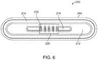 FIG. 5 illustrates a connector insert according to an embodiment of the present invention.Connector insert200 can be housed byshell240.Front extension212 ofattraction plate210 can be arranged to fit in opening310 ofbottom housing301 ofelectronic device300 as shown inFIG. 3.Front extension212 can supportcontact housing220.Contact housing220 can support contacts230 (shown inFIG. 8) having contactingportions232. Contactingportions232 can be exposed inrecess214 infront extension212 ofattraction plate210.