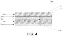 FIG. 4 includes an illustration of a cross-sectional view of a portion of another examplecomposite film400 according to embodiments described herein. As shown inFIG. 4, thecomposite film400 may include a firsttransparent substrate410, a firstanti-reflective coating420 overlying afirst surface412 of the firsttransparent substrate410, a secondanti-reflective coating430 overlying asecond surface414 of the firsttransparent substrate410, a firstadhesive layer440 overlying asurface422 of the firstanti-reflective coating420 and a secondtransparent substrate450 overlying the firstadhesive layer440.
