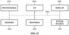 It should be noted that the components of the electronic device2500 can be controlled by multiple processors. For example, select components of the electronic device2500 (e.g., a sensor2525) may be controlled by a first processor and other components of the electronic device2500 (e.g., the display2505) may be controlled by a second processor, where the first and second processors may or may not be in communication with each other. In some cases, theprocessor2510 may determine a biological parameter of a user of the electronic device, such as an ECG for the user.
