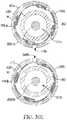 FIGS. 20-36 illustrate an example sequence of operation of a portion of the bifurcated implant delivery system in a first example use configuration, including selected cross-sectional views; and