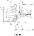 FIG. 2A shows a top-down view100 illustrating anultrasound transducer array22 directing beams ofultrasound energy102 into a patient13 having atissue volume110. Thetissue volume110 may include a target region108 (for example, a region of tissue in the brain), an obstacle104 (for example, a skull, a rib cage, a spinal vertebra, or a surgical scar), and other regions associated therewith, such asregions106,130 in the path of the ultrasound beams from thearray22 to thetarget region108. Theobstacle104 may also be described as a second propagation region. In various applications, theobstacle104 may not be avoidable when transmittingultrasound energy102 between thearray22 and thetarget region108, particularly the target points112,113. As illustrated, the beam ofultrasound energy102 is focused ononly target point112, but a multiple transmit technique may be used to focus on both target points112,113 simultaneously. Brain tissue may define afirst propagation region106. Thearray22 may be positioned as close to theobstacle104 as possible, but a distance may be present between thearray22 and theobstacle104. The region between theobstacle104 and thearray22 may be described as athird propagation region130.