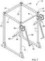 Generally, during use,system10 allows a person performing exercises to utilize a squat rack, i.e.frame12, to perform multiple different exercises by altering the vertical location of thelift assemblies26 on thecolumns14 and by altering thelift angle40. For example, thelift assemblies26 may be lowered to lower position such that a person lying on a bench will utilize a 0° lift angle and lift the weight plates upwardly in a conventional bench press type exercise to exercise the pectoral muscles. A similar exercise may be achieved with a 90° lift angle wherein the user faces away from the frame and sits up, thefirst arms36 extend down, and thesecond arms38 extend forward. Thus, when thefirst arms36 are pushed forward the user will receive an upper pectoral exercise. Location of the bench will also affect the exercise asFIG. 10 is a pectoral exercise whileFIG. 11 exercises the shoulders. The user may also use agreater lift angle40 such as inFIG. 8 and then pull down thefirst arms36 for back exercises, or the user may be seated and while facing a backrest of the bench and theframe12 to pull thefirst arms36, which are extending downwardly, toward the user. Other exercises including different squatting, bicep and triceps exercises may be performed as well as other variations of all exercises requiring either the pulling or pushing of weight. The point of greatest force may be altered by the changing of thelift angle40 such that the relative position of theweight plates58 to theaxle34 is altered.
