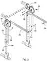 A pair oflifting assemblies26 is provided and are typically used in tandem with each other. Thelifting assemblies26, however, may be used in some circumstances independently from each other in a solo condition. Each of thecolumns14 has one of thelifting assemblies26 mounted thereon. In some embodiments, thelifting assemblies26 are vertically movable along an associated one of thecolumns14 for reasons which will become clear below. Each of thelifting assemblies26 is releasably lockable at a selected position on the associated one of thecolumns14. That is, thelifting assemblies26 may be placed nearer or farther from the upper ends18 of thecolumns14 as needed.