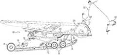 Thesensor182 could also be positioned differently to sense the angular position of the lower end of therear suspension arm50. For instance, with reference toFIG. 28, in this alternative embodiment, thesensor182 is connected to the right slide rail38 (alternatively, it could be the left slide rail38) near a pivot (corresponding to350 inFIG. 27), defined betweenright slide rail38 and theright rocker arm57. Thesensor182 senses a magnetic field generated by a magnet (not shown) such as themagnet333 that is connected to the lower end of therocker arm57. The magnetic field sensed by thesensor182 thus varies as the lower end of therocker arm57 moves relative to thesensor182. As such, the magnetic field sensed by thesensor182 is indicative of the angular position of the lower end of therocker arm57 relative to theslide rail38. In turn, the angular position of the lower end of therocker arm57 can be used at least in part to determine the angular position of the lower of therear suspension arm50. As can be seen, in such an embodiment, thewire328 connected to thesensor182 extends from thesensor182 forwardly along theright slide rail38 and then upwardly along thefront suspension arm40 to be bundled together with thewire326 described above to form theharness329.