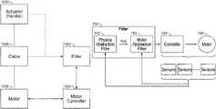 The set of equations that describe the behavior of the motor (1006) are its filter (1002). This filter (1002) ultimately affects how the system feels to a user, how it behaves to a user, and how it is controlled. A motor may be controlled in many ways: voltage, current, torque, speed, and other parameters. This is an important part of a filter (1002), because the filter includes equations that define the relationship between the intended behavior of the motor (1006) relative to how the motor (1006) is controlled.