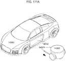 Another example of a robot that may implement the methods and techniques described herein includes a tire replacing robot.FIG. 170A illustratestire replacing robot13900 transportingnew tire13901 to replaceflat tire13902 ofcar13903.FIG. 170A illustratestire replacing robot13900 aligning its front end withflat tire13902 using sensors ofrobot13900.Tire replacing robot13900 may detect screws of the tire using computer vision techniques and may remove the screws usingscrew driver13904 and thenflat tire13902, as illustrated inFIG. 170B.FIG. 170C illustratestire replacing robot13900 rotating indirection13905 to attachnew tire13901 tocar13903 andFIG. 170D illustratesnew tire13901 in position andtire replacing robot13900 securingnew tire13901 tocar13903 by tightening screws usingscrew driver13904. In some cases, the tire replacing robot may be used to switch summer tires to winter tires. Similarly,FIG. 171A illustrates abattery replacing robot14000 witharms14001 for removingbattery14002 fromcar14003.Battery replacing robot14000 may align itself withbattery14002 using various sensors. Usingarms14001,battery14002 may be released fromcar14003 by triggering a lever or latch, as illustrated inFIG. 171B. Battery replacing robot may transportbattery14002 to a repair or replacement station.FIG. 171C illustratesbattery replacing robot14000 transporting a repaired ornew battery14004 for installation oncar14003. In some cases, an application may be used to request different types of service robots to a particular location at a particular day and time, such as those illustrated inFIGS. 170A-170D and 171A-171C. A control system may receive the request and deploy the request service robot to a designated location on a designated day and time. The control system may determine which service robot to deploy based on robot capabilities, current location of the robot, the designated service location, the battery charge of the robot, etc.