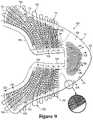Courses within a knitted component are generally parallel to each other. Given that a majority of inlaidstrand152 follows courses withinknit element151, it may be suggested that the various sections of inlaidstrand152 should be parallel to each other. Referring toFIG. 9, for example, some sections of inlaidstrand152 extend betweenedges153 and155 and other sections extend betweenedges153 and154. Various sections of inlaidstrand152 are, therefore, not parallel. The concept of forming darts may be utilized to impart this non-parallel configuration to inlaidstrand152. More particularly, courses of varying length may be formed to effectively insert wedge-shaped structures between sections of inlaidstrand152. The structure formed inknitted component150, therefore, where various sections of inlaidstrand152 are not parallel, may be accomplished through the process of darting.