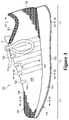 Similar to inlaidstrand132, inlaidstrand152 repeatedly extends fromperimeter edge153 towardinner edge155, at least partially around one oflace apertures158, and back toperimeter edge153. In contrast with inlaidstrand132, however, some portions of inlaidstrand152 angle rearwards and extend to heel edges154. More particularly, the portions of inlaidstrand152 associated with the mostrearward lace apertures158 extend from one of heel edges154 towardinner edge155, at least partially around one of the mostrearward lace apertures158, and back to one of heel edges154. Additionally, some portions of inlaidstrand152 do not extend around one oflace apertures158. More particularly, some sections of inlaidstrand152 extend towardinner edge155, turn in areas adjacent to one oflace apertures158, and extend back towardperimeter edge153 or one of heel edges154.