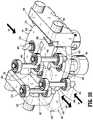 As shown at least inFIGS. 2, 3 and 5A, eachdrive shaft260,262,264,266 extends between afirst end270 and asecond end272, and defines a respective longitudinal axis “X1” therealong. First ends270 are configured for connection with a motor (Motor1 . . . n) that drives rotational movement ofdrive shafts260,262,264,266 withinbores220,222,224,226. Second ends272 extend substantially perpendicularly from firstplanar surface214 ofbase portion204 and into space or cavity “S.”