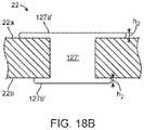 For therivet127 after it is placed in thehole22 the side opposite the head is subjected to a swaging process. With reference toFIG. 18B there is shown in cross-section thedeformed rivet127′ in thehole22. Therivet127′ has ahead127a′ that extends from thesurface22aby an amount h2. The length h2 may be about 25 microns, between 25 and 50 microns or between 5 and 50 microns. The same dimensions apply to atail127b′ that extends from the opposite surface of the link (e.g., luminal surface). The diameter of thehead127a′ can be larger than the tail, or thetail127b′ diameter can be larger than thehead127a′ diameter. The tail portion is formed from the extended shank length that protrudes from the link surface by swaging. Thetail127b′ is formed by swaging. For example, therivet127 is placed in fromsurface22a(abluminal side) so that a significant portion of the shank length, e.g., 50% of the strut thickness, extends from the luminal side. A cylindrical mandrel (not shown) is placed through the scaffold's bore. This mandrel has an outer diameter slightly less than an inner diameter of the scaffold and provides a swaging surface to form thetail127b′. The mandrel is rolled back and forth over shank portion extending form the luminal surface. This motion causes the shank material to flatten out around the hole, thereby producing thetail portion127b′. The resultingrivet127′ is secured in place, at least in part, by thetail portion127b′ resisting forces tending to push the rivet towards the abluminal side of the hole and thehead portion127a′ resisting forces tending to push the rivet towards the luminal side of thehole22. As shown, the deformation of the shank produces thetail127b′ having a flange disposed on thesurface22b.The flange may be circular like the head and may have a flange radial length greater or less than the radial length of the flange of thehead127a′.
