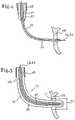 According toFIG. 4, in the next step, asecond dilation cannula17 is pushed over and along thefirst dilation cannula16. In thetip portion20, thesecond dilation cannula17 is also already bent at about 90° with respect to themain portion26, with sufficient pretensioning. However, with the aid of theguide sleeve18 arranged on the outside, thetip portion20 of the second dilation cannula is kept straight, in such a way that the cannula can be advanced straight over the entire main portion of thefirst dilation cannula16. The first dilation cannula also contributes to stiffening the second dilation cannula. As soon as the second dilation cannula reaches the position as perFIG. 4, the physician prevents theguide sleeve18 from following the advance movement of the second dilation cannula, such that the tip portion leaves theguide sleeve18 and, in accordance with the pre-bending, assumes the bent position as shown inFIG. 5. The unsupported position of the cannulas as perFIG. 5 is designated here as the functional position, whereas the supported, straightened position of the respective tip portions is designated as the application position.