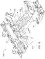 FIG. 2 is partially exploded view of therow crop head14. Referring toFIG. 2, therow crop head14 also includes a plurality ofrow units30. Therow units30 define aslot32 through which crops are fed for harvesting. Therow crop head14 also includescrop dividers34. As shown, each of thecrop dividers34 includes afirst cover portion36 and asecond cover portion38 positioned proximal to thefirst cover portion36. Thefirst cover portion36 and thesecond cover portion38 may have a hingedconnection40. Thecrop dividers34 are located between laterallyadjacent row units30. Thecrop dividers34 direct corn stalks into theslots32 of therow units36. As shown inFIG. 2, somecrop dividers34 are shown removed from associatedrow units30.