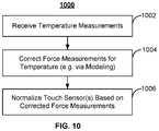 The force measurements received (e.g. at702) are corrected for temperature, at1004. Thus, the portion of the force measurements (e.g. voltage, strain, or absolute force) based on temperature-induced changes may be accounted for (e.g. subtracted from the force measurements). In some embodiments, only the force measurements corresponding to touch inputs being detected are corrected. For example, only force measurements corresponding to time intervals t1, t2, t3, t4 and t5 of diagram900 are corrected at1004. In some embodiments, all force measurements are corrected. In some embodiments,1004 corrects raw data received at1002, such as voltage. In some embodiments,1004 corrects the strain corresponding to the raw data. In some embodiments,1004 corrects the absolute force corresponding to the strain. Thus, an absolute force may be provided at1004. In some embodiments, the correction at1004 is based upon a model that is dynamically adapted. The baseline force measurements (force measurements in the absence of a touch detected by the touch sensors) are tracked as part of1004 and/or702. The profile of the force measurements across multiple force sensors may also be determined at1004. If the profile indicates that the touch surface is not being subjected to a bend, the temperature model may be updated to reflect characteristics of the baseline. Further, the model may include factors such as adhesive used in conjunction with the force sensors, aging of the force sensors and/or other factors. Consequently, the model may provide a more accurate, adaptive correction to the force measurements. Further, bends may also be accounted for. For example, at1004 the profile may be utilized to adjust a correction for temperature in the presence of a both a bend and a user touch. Thus, the force measurements may be corrected for temperature and/or other effects at1004.