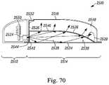 FIG. 70 is a cross-sectional view throughinsect trap2510. For clarity,cord2516,plug2530 andconductive prongs2522 are not shown in this view. In some embodiments,base portion2512 has acircuit board2550 having a programmable processor or chip (not shown) for executing commands, electrically connected tocord2516,conductive prongs2522, andLEDs2524. For clarity, however, not all of the electrical connections are shown.Circuit board2550 may include electronic circuitry to receive ordinary household current fromconductive prongs2522 and provide power to illuminateLEDs2524.Circuit board2550 may include an energy stabilizer such as a full wave rectifier circuit or any other circuit that may provide steady voltage toLEDs2524, although it may also provide a varying voltage toLEDs2524 to provide a flickering light which mimics movement that some insect species may find attractive.Circuit board2550 may provide power toLEDs2524 to provide UV and/or visible and/or IR light, although it may be configured to provide power toonly UV LEDs2524 or to onlyvisible light LEDs2524 or toonly IR LEDs2524, or to provide variable power to produce combinations of flickering UV and/or visible and/or IR light.Circuit board2550 may also be configured to drive a transmitter or transceiver such as a piezoelectric speaker (not shown) or other device that may be mounted inbase portion2512 to emit insect-attracting sounds or vibrations. In some embodiments, the transmitter or transceiver may emit recorded and/or generated insect sounds or vibrations to better attract insects, and may include one or more of insect call, reply, courtship and copulatory songs. In some embodiments, the transmitter or transceiver may emit recorded and/or generated insect-attracting sounds or vibrations such as the heartbeat of a mammal. For example, the transmitter or transceiver may emit an insect-attracting sound or sounds having a frequency in the range of approximately 0.5 Hz (e.g., the heart rate of large mammals) to approximately 240 kHz (e.g., the highest frequency detectable by insects). In some embodiments, the frequency is in the range of approximately 5 Hz to 100 kHz. In some embodiments, the frequency is in the range of approximately 35 Hz to 50 Khz. It is desirable for such insect-attracting sound to be detectable by an insect within approximately a 2-meter distance frominsect trap2510. It is desirable for such insect-attracting sound to be undetectable by a human beyond approximately a 1-meter distance frominsect trap2510.