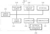 As shown inFIG. 2, thecontrol module150 includes logical components, for example, thepositioning sensor210, theforce sensor240, theobstacle sensor220, theinterface230, thecontroller250, thecamera sensor260, and acommunicator280.