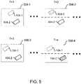 FIG. 5 depicts an embodiment of scanning forcodes104 over multiple frames508. In some configurations, scanning for codes (e.g., identifying and/or decoding codes) can be computationally intense. Identifying a code comprises ascertaining that a code is present in the image and/or a position of the code in the image. Decoding a code comprises ascertaining what the code represents. For example, identifying a barcode includes ascertaining that a barcode is present in a frame, and decoding the barcode comprises interpreting a series of white and black lines of the barcode to represent a numerical string. By distributing scanning across multiple frames, computation can be distributed in time.FIG. 5 depicts a first frame508-1, a second frame508-2, a third frame508-3, and a fourth frame508-4. InFIG. 5, scanning is performed over multiple frames. In the first frame508-1, a first code104-1 and a second code104-2 are tracked. In the second frame508-2, a scan for codes is performed in just the top half of the second frame508-2. Accordingly, the first code104-1 is identified and decoded, while the second code104-2 is tracked without being decoded. In the third frame508-3,codes104 are tracked. In the fourth frame508-4, a scan for codes is performed in just the bottom half of the fourth frame508-4. Accordingly, the second code104-2 is identified and decoded while the first code104-1 is tracked without being decoded. In some embodiments, a frame508 is divided into quadrants and discovery of new codes (e.g., a scan) is performed on each quadrant every fourth frame. In some embodiments, “attention” or “scene semantic” based decoding are used. In some configurations, this can mean that decoding can be limited to frames or parts of the observed scene that undergo a drastic visual change, and/or decoding can be limited to regions that are of special interest for a specific task (e.g., barcode labels, parts of a shelf unit, etc.).