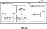 FIG. 23 is a simplified block diagram of acomputing device2300.Computing device2300 can implement some or all functions, behaviors, and/or capabilities described above that would use electronic storage or processing, as well as other functions, behaviors, or capabilities not expressly described.Computing device2300 includes aprocessing subsystem2302, astorage subsystem2304, auser interface2306, and/or acommunication interface2308.Computing device2300 can also include other components (not explicitly shown) such as a battery, power controllers, and other components operable to provide various enhanced capabilities. In various embodiments,computing device2300 can be implemented in a desktop or laptop computer, mobile device (e.g., tablet computer, smart phone, mobile phone), wearable device, media device, application specific integrated circuits (ASICs), digital signal processors (DSPs), digital signal processing devices (DSPDs), programmable logic devices (PLDs), field programmable gate arrays (FPGAs), processors, controllers, micro-controllers, microprocessors, or electronic units designed to perform a function or combination of functions described above.