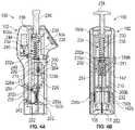 Upon advancing theproximal carriage230 from the starting position to the armed position, theproximal carriage230 engages the rampedend surface248 of theproximal stop240 to shift theproximal stop240 in a first direction (e.g., to the left inFIG.4A) out of the path of theproximal carriage230. When therecess246 is aligned with theproximal stop240, theproximal stop240 shifts in a second direction (e.g., to the right inFIG.7A) into therecess246 of theproximal carriage230 to hold theproximal carriage230 in a loaded state, in which the biasingmember238 is compressed between theproximal carriage230 and theproximal end portion202aof theneedle cartridge202. Thesolenoid244 may be in communication (e.g., wireless or wired) with a trigger controller8 (FIG.1) for activating thesolenoid244 to move theproximal stop240 out of engagement with therecess246 of theproximal carriage230.
