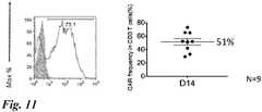 FIG.11 depicts the gene introduction rate when the pIRII-CAR.CD19_optimized vector was used. The result of flow cytometry (left) and the proportion of the CAR expression cell in the CD3-positive T cells (right) are represented. N=9.