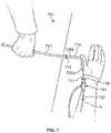 In an exemplary embodiment,retainer device650 includes aframe651 and one or more retention features652 configured to hold a curvable portion and/or other components of an exemplary sheath assembly in a selected configuration.Retainer device650 may be positioned proximate a patient access site, for example, to facilitate handling and use of a sheath assembly. For example, when used to access a radial artery,retainer650 may be positioned on a hand, wrist, or other location of a patient's arm to secure support sheath600 in a desired position relative to accesspoint630.