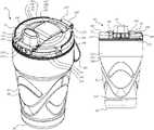 In general,first portion22 may also be referred to as the body ofliquid container assembly20, and may also be termed a vessel, can, canister, jug, stein, mug, base, container, glass, vase, canteen, tumbler, reservoir, cup, cup-shaped container and so on. However it may be termed, it is a vessel in which to hold and transport liquid. The liquid may be a beverage. Usually, whencontainer assembly20 sits at rest on a surface such as a table or counter-top, or in a drink-holder in a vehicle,first portion22 is the lower or bottom, or base portion ofcontainer assembly20, andsecond portion24 is the upper or top portion. Similarly, there is a variety of names that may be used forsecond portion24. It may be termed a closure, or closure member, or closure assembly, or cap, or lid, or cover, or top. There are many possible terms that could be used as nomenclature for an object or assembly that mates with, and provides a covering for, the vessel for containing liquids. From this point,first portion22 will be referred to as the cup or main body; and, similarly,second portion24 will be referred to as the container lid assembly.
