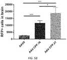 FIGS.5A-5B depict representative images of brain sections and their quantitative analysis after intravenous administration of AAV9, AAV.CPP.16 and AAV.CPP.21 in C57BL/6J inbred mice. All candidate AAVs express nuclear red fluorescent protein (RFP) as reporter. The dose of AAV is 1×1012vg per animal. Each white dot inFIG.5A represents a RFP-labeled cell. InFIG.5B, *P<0.05, ***P<0.001, ANOVA.