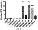 The relative abilities of AAV-CAG-H2B-RFP and AAV.CPP.16-CAG-H2B-RFP to transduce various tissues in mice was also evaluated. 1×1011vg was injected intravenously. The number of cells transduced was normalized to the number of total cells labeled by DAPI nuclear staining. The results showed that AAV.CPP.16 was more efficient than AAV9 in targeting heart (FIG.9A); skeletal muscle (FIG.9B), and dorsal root ganglion (FIG.9C) tissue in mice.