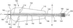 The drivingelement128 shown inFIG.1ais in the shape of an elongated cylinder with a series of circumferentially spacedprojections132. As shown inFIG.1a, theprojections132 are evenly spaced about the circumference of the cylinder. Theprojections132 in this embodiment are rounded or curved and extend along a part of or an entire length of the drivingelement128 defining therebetweenlongitudinal grooves130 that extend along a part of or an entire length of the drivingelement128. Theprojections132 form protruding surface features to non-rotatably engage with thehead portion208 of theendcap200. Alternatively, the driving element may have an elongated shape with a polygonal cross-section or a substantially polygonal cross-section, for example, a cross-section that is substantially hexagonal (e.g., a hex-key) in a plane orthogonal to a longitudinal axis L1 of theshaft120.