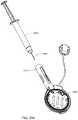 Referring now also toFIGS.252A-252D, in practice, the fillingsyringe9132 is attached to the fillingaid9100. In some embodiments, the fillingneedle9134 may be attached to the fillingsyringe9132, however, in some embodiments, the fillingneedle9134 may have already been attached to the fillingsyringe9132, for example, at manufacture. The cap (not shown) of the fillingneedle9134 may then be removed. Next, the fillingaid9100 is attached to a vial of fluid9136 by using the tabs features9120 of the lockingportion9104. The vial of fluid may contain e.g., therapeutic fluid, e.g., insulin. The fillingneedle9134 may penetrate theseptum9138 and the fluid may flow from thevial9136 to the fillingsyringe9132 by way of the fillingneedle9134. Once a desired volume of fluid flows from thevial9136 to the fillingsyringe9132, thevial9136 may be removed from the lockingportion9104, e.g., by exerting opposing force onto the lockinghousing9104 and thevial9136 so as to disconnect the tabs features9120 of the lockingportion9104 from thevial9136.